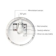 Mikrotalasni senzor detektuje pokret do 5 metara i automatski pali svetlo, sa mogućnošću podešavanja vremena osvetljenosti (od 20s do 10min)