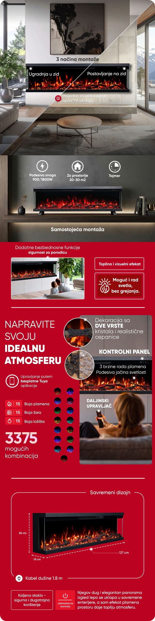 Ovaj smart 3u1 električni panorama kamin unosi toplinu i lep vizuelni efekat u prostor, pa je odličan izbor za dnevnu sobu, spavaću sobu ili apartman