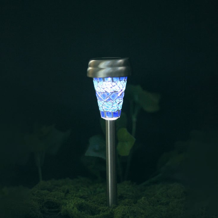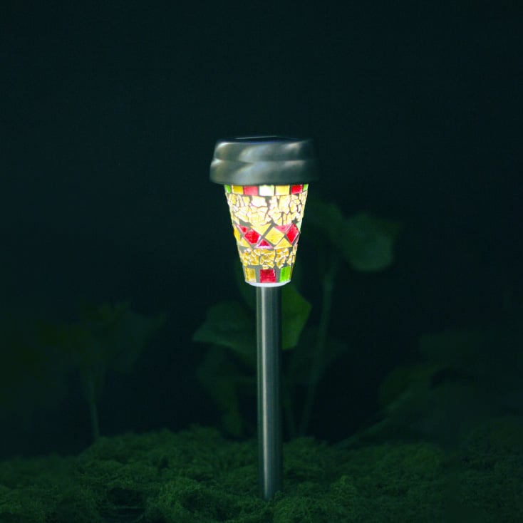Modee LED solarna baštenska lampa GS030 sa jedinstvenim šarenim mozaik staklenim abažurom predstavlja dekorativni dodatak koji unosi posebnu atmosferu u svaki vrt ili terasu
